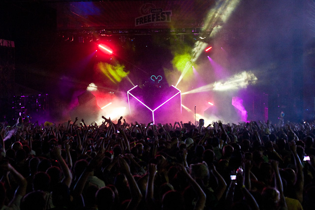 Closing out the evening was DeadMau5, the beloved but flavorless DJ whose limp beats are overlooked on account of his large, illuminated mask. Is he a genuine youth phenomenon or a mysterious creation cooked up by Banksy meant to illustrate the ridiculousness of techno? It was a question only the observers in the back were left asking. Those in front were too busy dancing.