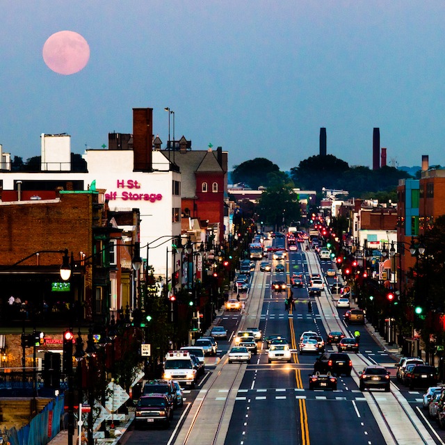 Flickr contributor theqspeaks uses the foreshortening effect of a telephoto lens to amplify yesterday’s already spectacular harvest moonrise over H Street NE. (EXIF.)