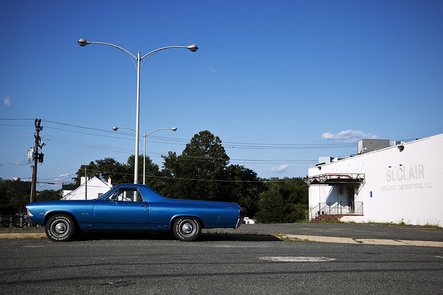 Car pulls up, who can it be? Sadly, no sign of Kilo G in Satirenoir‘s gorgeous shot of a sparkling blue El Camino on Shields Avenue in Alexandria. (EXIF.)