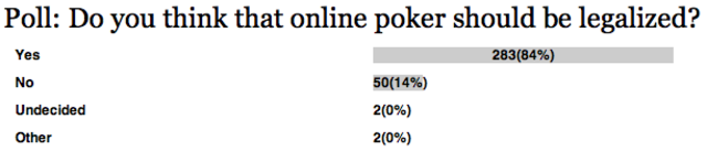 Poll conducted by the Washington Times.* And of course, by a “large majority of people,” I mean “a large majority of Washington Times readers — a sizable number of which are people who were encouraged to stuff the ballot by people who don’t live in the District of Columbia, but really like playing online poker — approve of legalizing online poker.” Not that it’s stopping Michael Brown — the at-large D.C. Councilmember who is under fire for slipping internet gaming legalization into a budget bill last year — from boasting about the results of this rigorously academic survey.