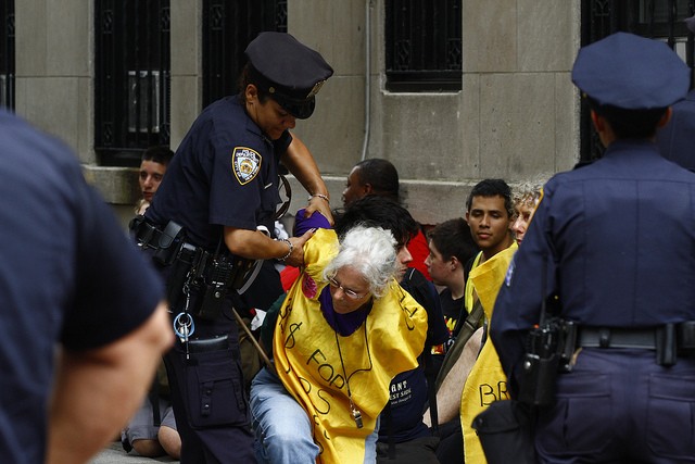 - Gothamist watched as protesters began to occupy Wall Street to protest corporate hegemony. The NYPD used an anti-mask law from 1845 to arrest protesters early on and the arrest total hit the triple digits yesterday as police pepper-sprayed already-penned in protesters.