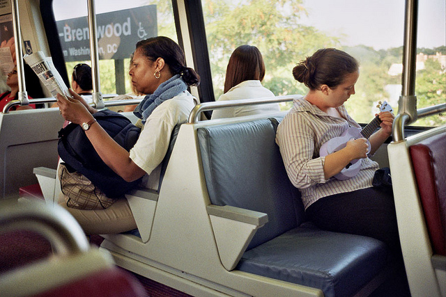 So you’re on the Metro, reading the paper or staring out the window, deep in your own thoughts. Suddenly, your mellow is harshed by the annoying plink of someone trying to play “I’m Yours” on a lavender ukelele. Okay, so maybe it wasn’t quite that bad — photographer Paul Sharratt provides no editorial comment — but how would you react to someone strumming a stringed instrument on your train?