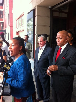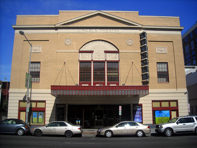 Cynthia Robbins, flanked by Rick Lee and Councilmember Jim Graham.Representatives from the Lincoln Theatre’s board of directors, standing alongside local promoters and Ward 1 Councilmember Jim Graham, made their case in front of the historic theater this afternoon: without a $500,000 boost in operational funds from the city at the beginning of the 2012 fiscal year, they would likely be forced to close at the end of the year.