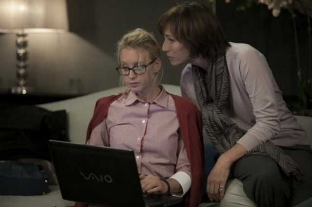 Kristen Scott Thomas plays Christine, an executive at the Paris office of a U.S. multinational corporation that appears to be involved in agribusiness in some way; their exact focus is ill-defined. Ludivine Sagnier is Isabelle, a lower-ranking colleague who, as the film begins, is helping Christine finish up the details of a big deal that’s about to be negotiated in Cairo. This first scene sets up the odd relationship between the two right from the start: Isabelle is driven and ambitious, determined to work her way up on the strength of hard work and ideas; Christine has already made it near the top, and sees her power as something she can use to toy with others. So she flirts with Isabelle in a manner that Human Resources surely wouldn’t approve of, and then, when her husband Philippe (Patrick Mille) walks in the door, grabs him for an ostentatious display of affection that is surely meant to mess with Isabelle’s head even more.