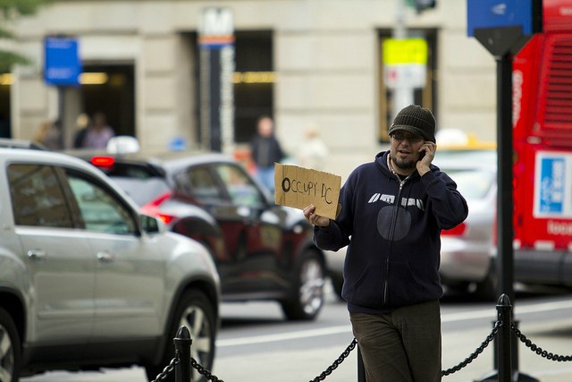 Some of the highlights from the weekend? Well, President Barack Obama’s motorcade drove by, there was the completion of a few general assemblies to address the various grievance of the people who showed up, and a temporary relocation to Franklin Park, after one of the protesters brought a coffin with “Death to Death Penalty” written on it that police thought was a suspicious package. A few protesters even tried to spend the night on the sidewalks around McPherson Square, despite the chilly temperatures and the rain: