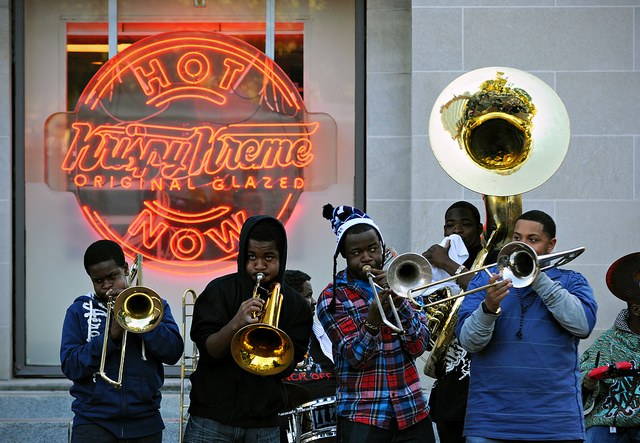 Hot and cold. Warm glaze and cool jazz. Somehow the composition and timing of this shot just work; the swoop of the jazz line seemingly hugs the Dupont Circle beacon of delicious fried goodness. Play on.