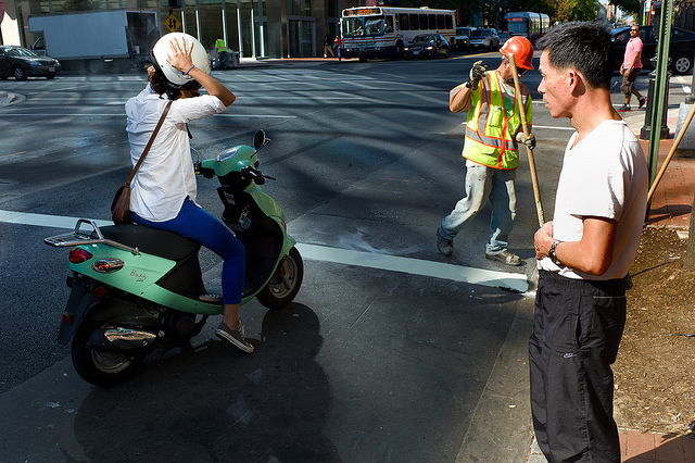 Here’s another intriguingly random assemblage of people framed by Matt.Dunn. But maybe there’s an untold story behind the shot — the scooter rider looks like she’s pulling herself together, perhaps after tumbling off in an attempt to avoid ruining the line-painter’s work? (Or maybe not.)