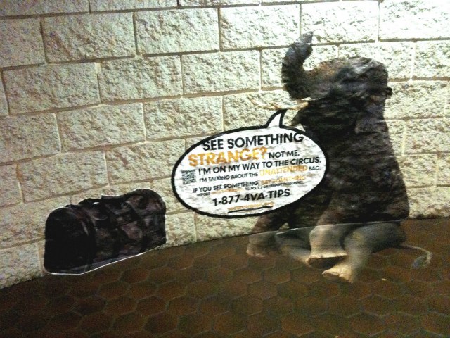 The ads are actually funded by the Department of Homeland Security, and are part of a new ad campaign which prominently feature three-dimensional elephants and canisters of explosives outfitted with Groucho Marx masks. The ad campaign — called Secure Transit — also provides riders with the “eight signs of terrorism” and how to spot someone who might be casing a station. (Thankfully, “taking photographs” is not on the list — though ” videotaping, sketching or taking notes on transit equipment and facilities or security equipment” is.)