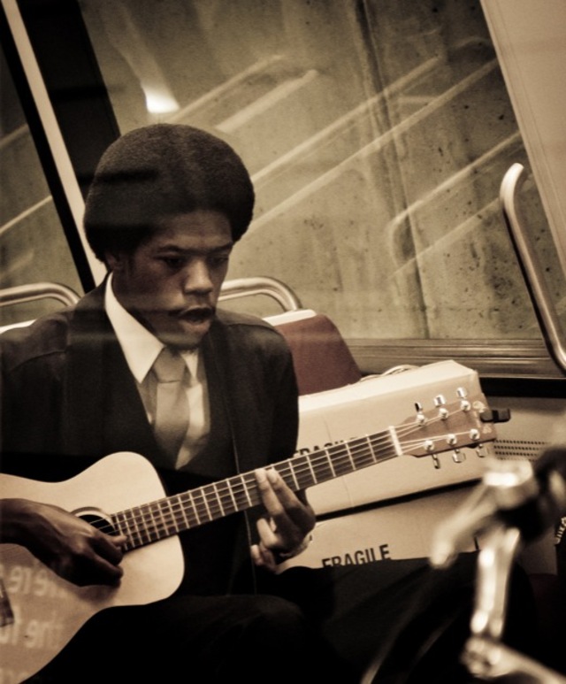 I’m used to musicians busking away at various Metro stops, but normally they aren’t on the trains. ep_jhu spotted this guitarist who seemingly decided he didn’t want to wait for you to come to him, and is going to ride around serenading you all day. (EXIF.)