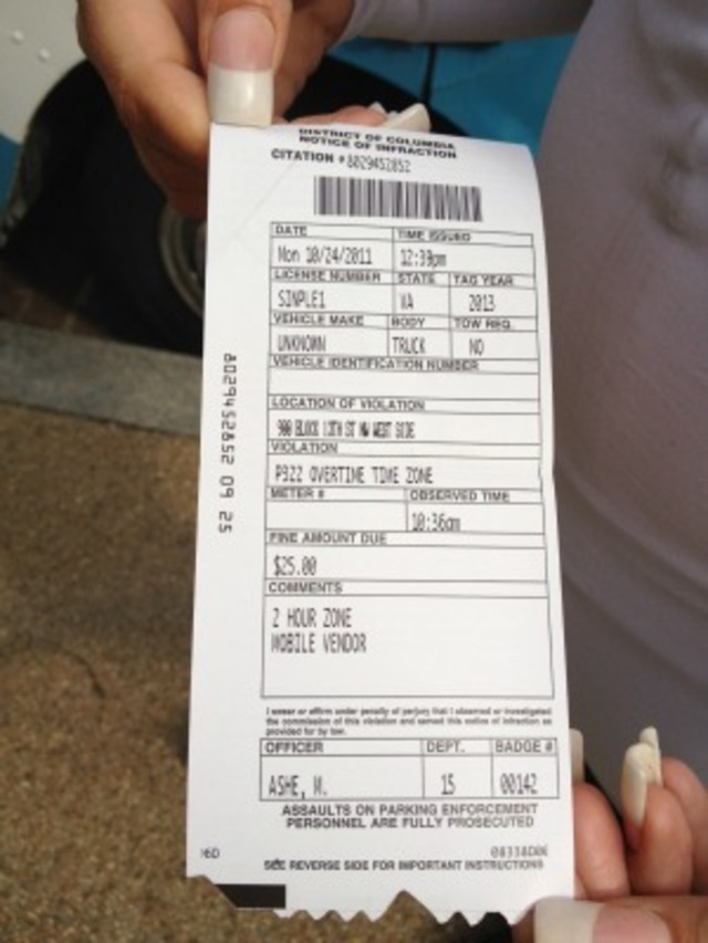 Sinplicity’s parking ticket. (Kat Lucero)It may be a day to celebrate food, but that doesn’t mean that local parking enforcement is taking things easy. A large group of food trucks which had gathered around Franklin Park as part of a K Street Food Truck Festival this afternoon were given tickets for standing in a parking space for more than two hours.