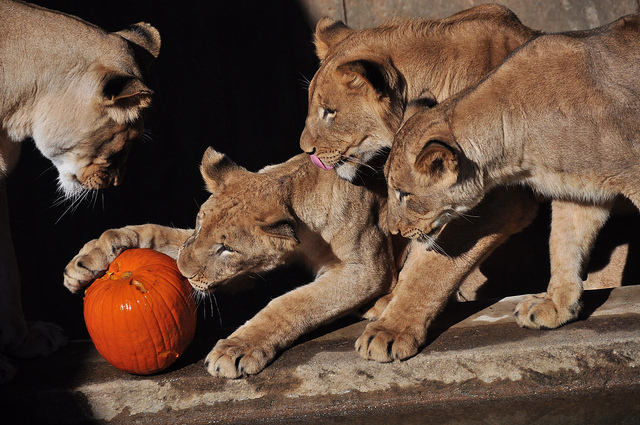 The King of the Jungle shares a bond of pumpkin love with pie eaters, seasonal latte drinkers, and squirrels everywhere. This really well-composed image from alexandrajones14, is adorable. The juvenile lion in the middle with his tongue out really deserves to be an internet star.