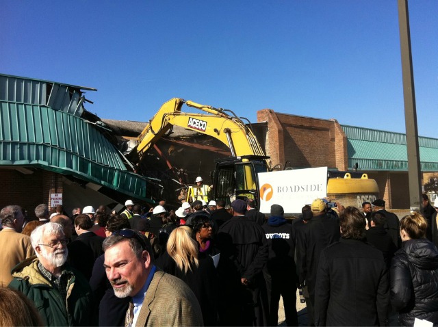 That September 2010 groundbreaking was far more ceremonial than even jaded observers imagined — but today, Mayor Vince Gray and friends swung by for the actual groundbreaking on the project, approximately 14 months or so after a shovel first hit dirt on the site. (We know they’re really serious this time, since they took a big swing at the existing structure with a piece of demolition equipment — plus, they recently got their financing in order.)