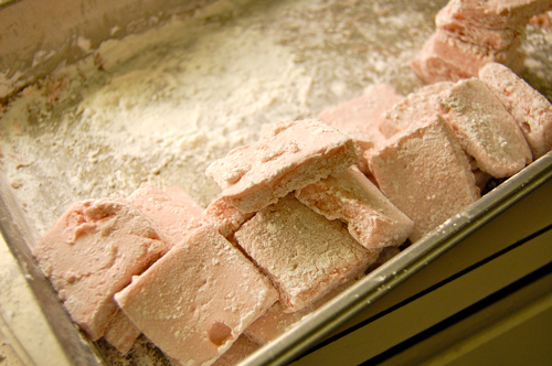 Pour the mixture in to the baking pan, and allow to sit uncovered three hours or overnight. Remove the marshmallow from the pan, cut in to pieces, and roll unpowdered sides in the reserved mixture.