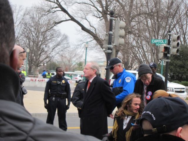 Voting rights protestors block Independence Avenue. (Benjamin R. Freed)Pete Ross, the shadow senator candidate, was the first to be arrested, perhaps burnishing his common-man bona fides after lending his campaign $102,000. DC Vote spokesman James Jones was as well, though the loudest cheers—mostly from the contingent of Occupy D.C. members, it seemed—were reserved for Adrian Parsons, the lead organizer of the hunger strike who is now in his eighth day of fasting. The cadaverous Parsons raised his weakened arms in the air before they were cuffed and he was wheeled into a Capitol Police wagon.