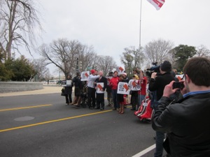 Instead, just about two dozen protestors, many of whom appeared to have come over from the Occupy D.C. encampment at McPherson Square, stepped into the eastbound lanes of Independence Avenue, holding DC Vote signs and placards opposing language in the budget resolution that would extend a ban on the use of District funds to pay for abortions that was implemented in an earlier federal budget standoff. In a statement released after the House voted 296-121 to approve the resolution, Del. Eleanor Holmes Norton said: “It is especially ironic that the final sticking point in the negotiations on the conference report was how to promote democracy in Cuba while the bill tramples on democracy in the ‘capital of the free world with a rider keeping its residents from spending their own local funds on abortion services for low-income women.’ “