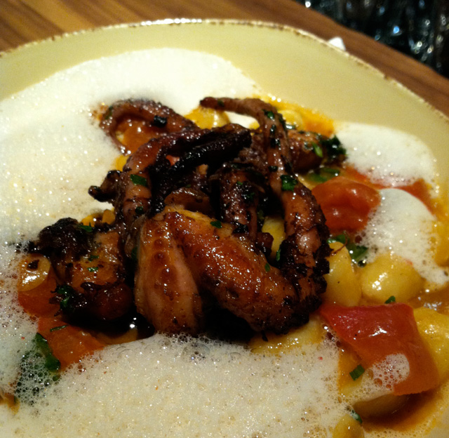 Fortunately, there are some great restaurants in town that get gnocchi just right such as Palena and Proof. A recent favorite is the gnocchi at Fiola. Rather than confining gnocchi to ordinary potato, Chef Fabio Trabbochi smokes the potatoes before mashing them up and shaping them in to pillowy bundles of pasta. He finishes them with octopus, crab, and a spicy tomato-basil sauce and a delicate cheesy foam. The octopus is spot on – grilled to an easy to chew tenderness with slightly charred and crisp tentacles. You can order a half portion—the Italian way—so you can enjoy some of the other great items on the menu as well.
