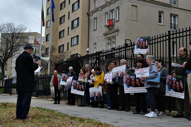 The refrain is part of a weekly protest outside the imposing black gates of the diplomatic mission, where every Monday interfaith vigils call for the release of a Jewish-American government contractor from Maryland who has been sitting in a Cuban jail cell since Dec. 3, 2009.