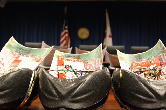 Councilmember Mary Cheh (D-Ward 3) left an Austermuhle-worthy bundle of presents for her colleagues yesterday with a holiday gift package of bicycle stuff. Cheh appeared to be continuing her efforts to make D.C. a more bike-friendly place.