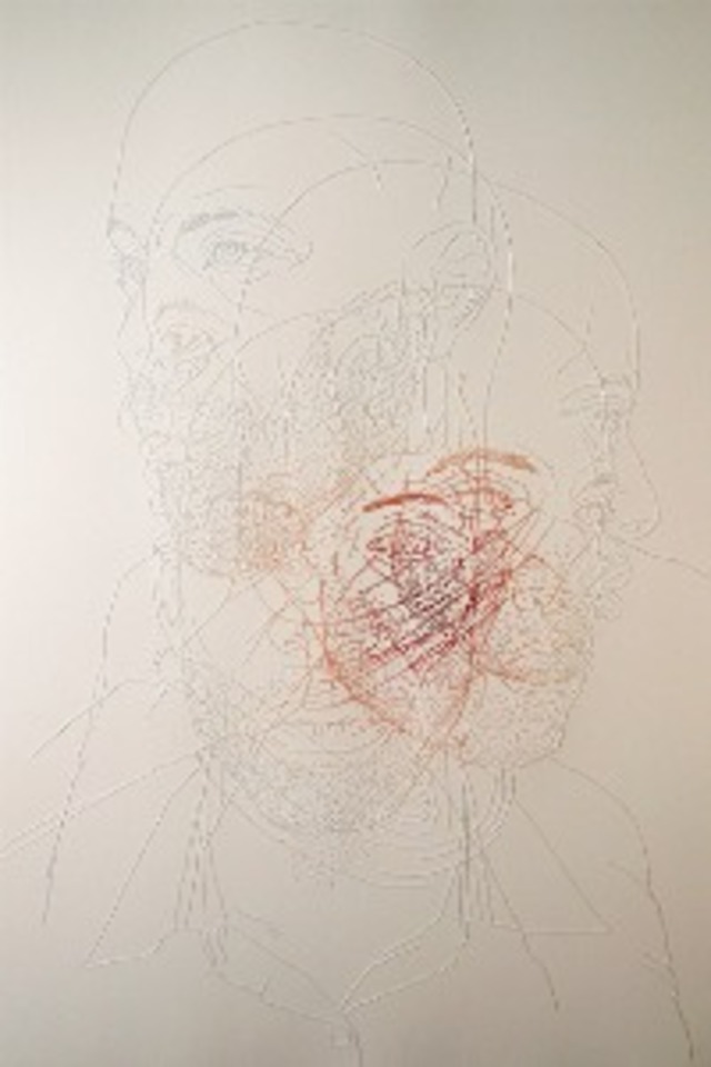 In “I Ain’t Yo Mama”, deSaussure brings the ex back into the picture. Here, she’s embroidered six closely overlapping images of a bald and stubble-bearded man with piercing eyes. Using paper, thin lines of thread, and tiny needled holes, this work is more delicate and precise than the big “Double Dare Ya.” It also contains color. Although most of the piece is done in white thread, the bottom quarter is a concentration of pinks and reds. From afar, this color splotch could almost be mistaken for the image of a heart. But deSaussure sees it more as a stain. “A stain is an unwanted remnant of past activity,” she says. “[The subject of the piece] is definitely an unwanted remnant of past activity. He definitely broke my heart more than once…If I intended it to be a heart, it would be black.”
