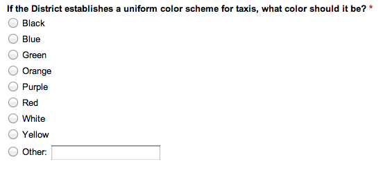 So Cheh is throwing it open. On the critical issue of what shade to paint the taxis, the councilmember’s poll offers several options: