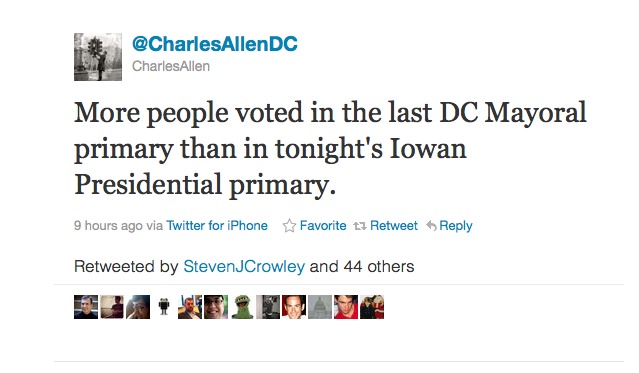 Iowa has close to two million registered voters, and only 122,000 participated in the caucuses. The District has a mere 450,000 registered voters, of which 134,000 participated in the 2010 mayoral primaries.