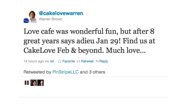 After Melody Records and Penn Camera announced they were closing their doors, now it’s Love Cafe’s turn. Owner Warren Brown tweeted yesterday that the baked good pioneer that has occupied the prime corner location at 15th and U Streets NW since 2003 would close on January 29.