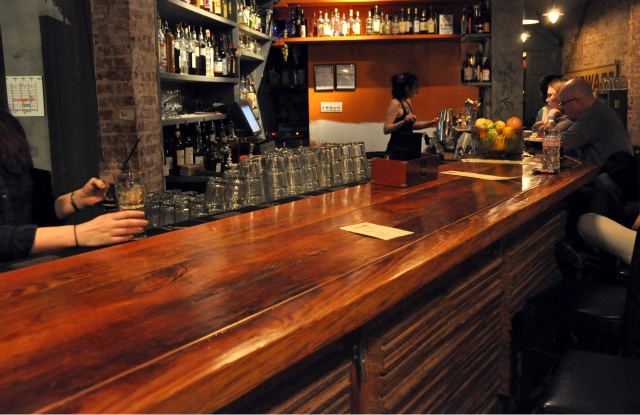The exposed natural wood-grain on the new top lends a classic aesthetic that was missing from the old black top, which suggested function rather than form. In hoping to avoid being too stodgy, the new bar still sports the tiki-paneling on the front face. Behind the bar, though, much has stayed the same, with only a few added shelves for storage.