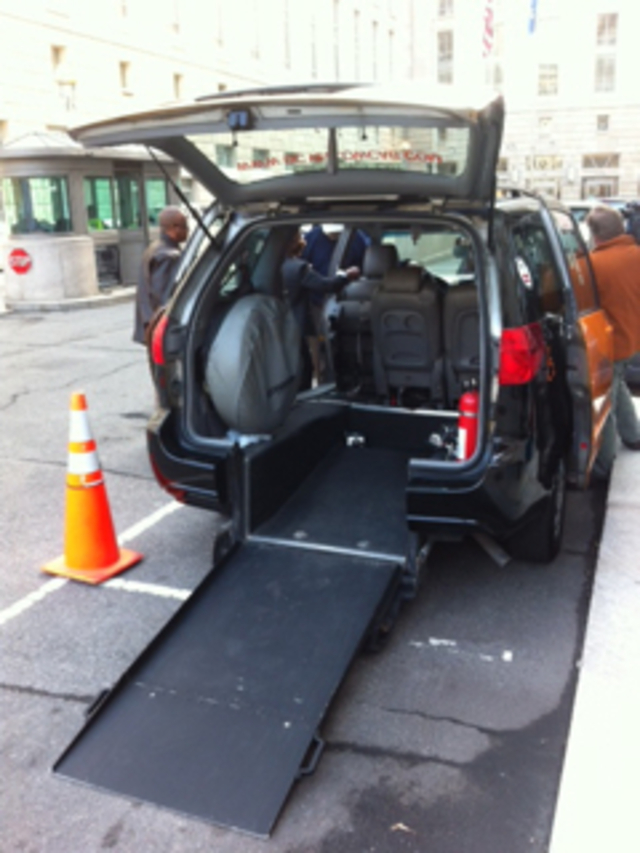 Cheh, who chairs the Environment, Public Works and Transportation Committee, inspected the accessible cab, a 2010 Toyota Sienna minivan converted to incorporate a wheelchair ramp extending from its rear door. The van is one of 10 operated by Yellow Cab Company of D.C.; Royal Cab also operates 10 of the vans.