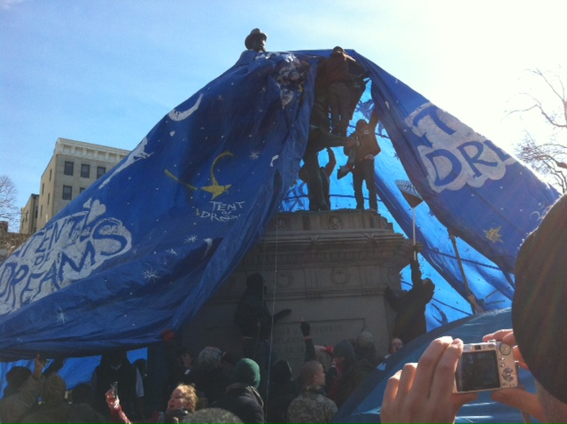 As a deadline hit for protesters at the Occupy D.C. encampment at McPherson Square to stop camping, occupiers draped a massive tarp over the statue of General James McPherson after which the park was named while chanting “Let us sleep so we can dream.”
