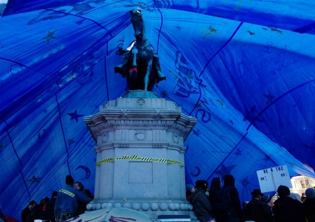 Members of Occupy D.C. woke up yesterday ready for a showdown at noon, which is when the Park Police said they would start issuing citations, making arrests and confiscating tents of those those deemed to be “camping”—defined as either sleeping or having bedding materials—instead of maintaining a round-the-clock vigil. No arrests have been made at either McPherson Square or the other Occupy settlement at Freedom Plaza. At McPherson Square yesterday, protesters draped a large blue tarp over the statue of Gen. James B. McPherson, the Civil War commander for whom the park is named. (Park Police have asked that the tarp, nicknamed the “Tent of Dreams” for its celestial decorations of stars and unicorns, be removed.)