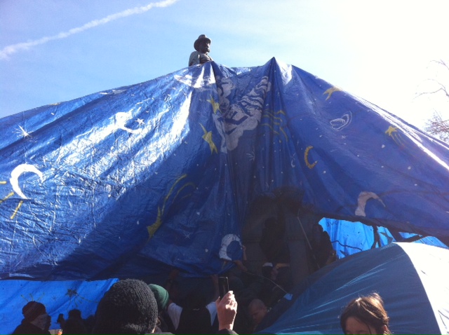 According to one protester in the park, the police gave no timeline but said they wanted the blue tarp — referred to as the “tent of dreams” — removed today. In response, occupiers have called an emergency meeting at noon to decide how to proceed.