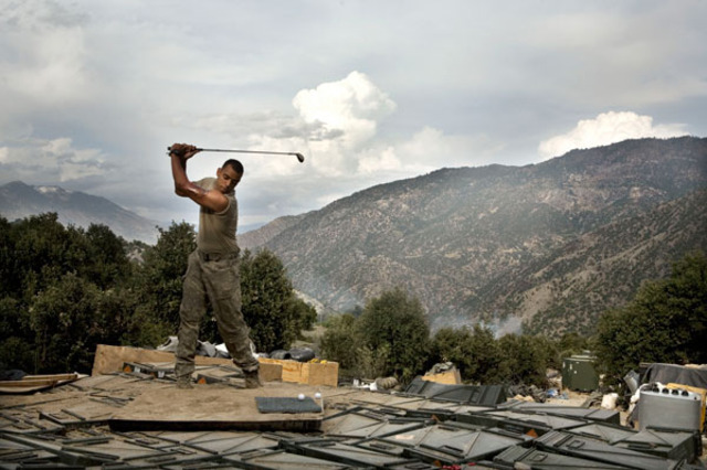 Tim Hetherington, Afghanistan, Korengal Valley, Kunar Province, Sterling Jones practices his golf swing while at the main KOP [Korengal Outpost] firebase in the valley. Soldiers spend about two weeks at the Restrepo outpost before coming back to the main KOP base, where they can get a hot shower and call their family., April 2008. Chromogenic (Lightjet) digital print. >> As 30 Americans comes to a close mid-month, the Corcoran Gallery of Art offers two new exhibitions, opening Saturday, that mark the 150th anniversary of the Civil War by highlighting the ways war has been documented with changing technology. Tim Hetherington: Sleeping Soldiers is a group of photographs of American soldiers defending Restrepo taken by the late photographer while embedded for a year with the Second Platoon of Battle Company of the U.S. 173rd Airborne Brigade in the Korengal Valley in eastern Afghanistan. A video piece blends footage of daytime conflict with still images of sleeping soldiers, in a multi-layered, three-screen video installation. Shadows of History: Photographs of the Civil War from the Collection of Julia J. Norrell brings together some of the earliest images of battle from the first war to ever be documented using the new medium of photography.