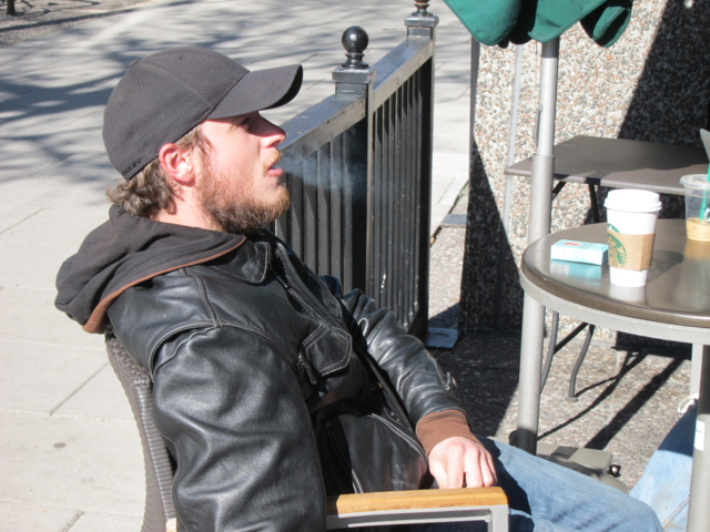 I decided to check back up on the sleep strikers earlier this afternoon. Lehner was sitting outside the Starbucks at 15th and K streets NW across from McPherson Square with Sam Jewler, the one-time hunger-striker who last year fasted for 11 days as a protest for D.C. statehood. Reges was nowhere to be found. He dozed off in a McPherson Square tent some time this morning, Lehner told me. A few other members of Occupy D.C. stayed up all night with them as a solidarity measure, but it’s really Lehner who’s carrying the torch for the sleeplessness right now.