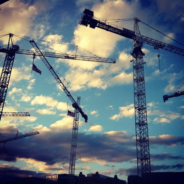 Construction cranes perform their delicate ballet in the evening sky. Photo by Jen Morrissey. (EXIF.)