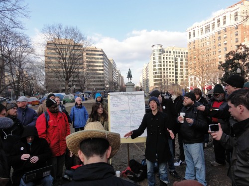 Yesterday afternoon some 60 protesters gathered in a newly barren park to discuss how a movement that so closely linked its message to its tactics could transition in a post-camping world. No longer was a presence enough to remind the one percent that the 99 percent was watching; from this point on, Occupy D.C. has to make its point without actually occupying.