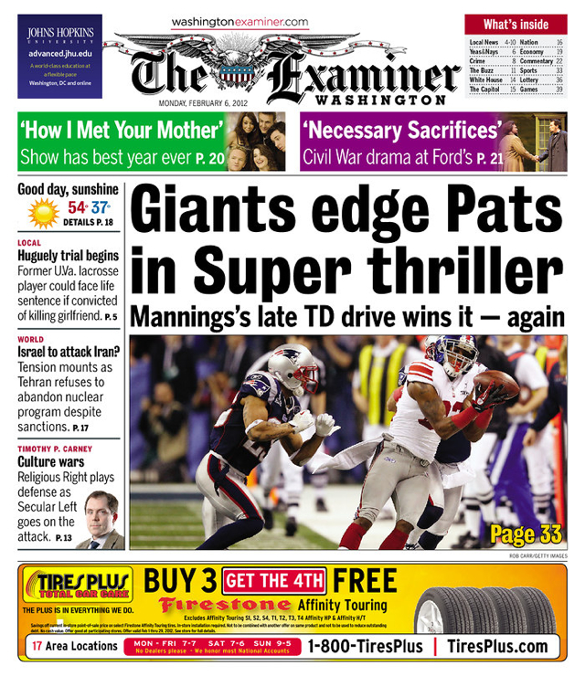 Via NewseumI almost didn’t believe it this morning when TBD’s Ryan Kearney, rounding up the post-Super Bowl front pages of local newspapers, spotted this clunker of a subhead in the Examiner, but a short while ago I happend upon a still-full Examiner box, and there it was.