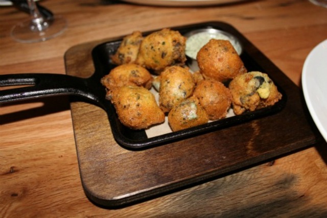 I’ve been peering in the windows of what would become Mintwood Place for what seems the better part of a year now, watching the shell transformed from two gutted retail storefronts to the restaurant that opened this week along Columbia Road in Adams Morgan. Recently I paused to peek in on the finished product—lots of reclaimed wood, including a mushroom wood-paneled bar that looks into an open kitchen, ironwork accents like a gate from New Orleans, light fixtures made from inverted fishbowls with rubber tubing, yellow-hued lighting, and cushioned alcoves built into the window space—and left with a reservation for dinner a soft opening that took place last week.