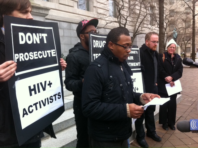 AIDS activist and patient Antonio Davis speaks in front of the Wilson Building yesterday on his case, which goes to trial in May.