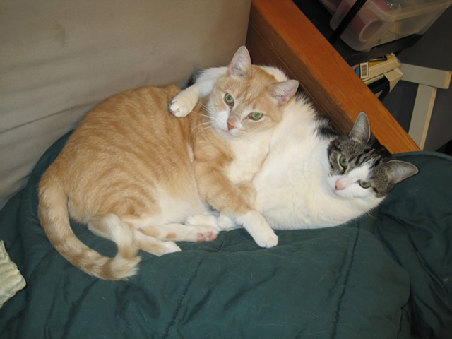 These two cats getting their snuggle on are Focus and Oscar. They are cute on their own, but their matching eyes are mesmerizing. Who can resist two cats that are so in love?