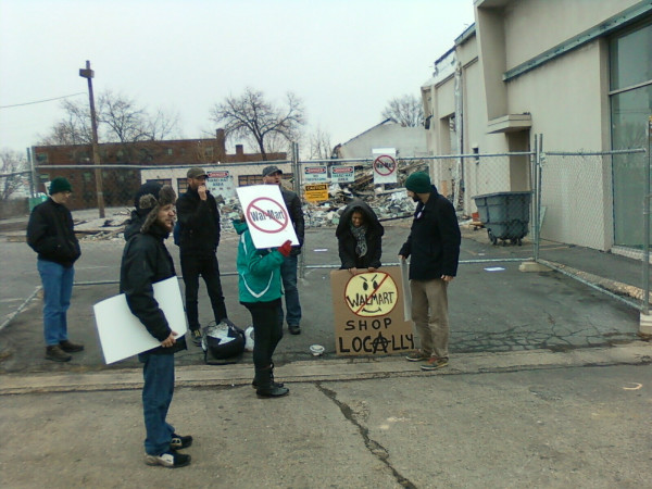 Progress on the Walmart construction site at 5929 Georgia Avenue NW was impeded earlier this morning when a group of demonstrators from Occupy D.C. stationed themselves in front of the old Brightwood car barn to prevent crews from continuing demolition ofwork on the site. About 25 people took part in the protest, said Occupy D.C. member Sara Shaw.