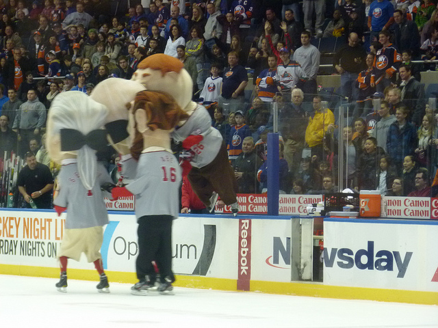 At last night’s game against the Ottawa Senators at Nassau Veterans Memorial Coliseum, the Racing Presidents popped up between the first and second periods, accompanied by the madcap theme to The Benny Hill Show. The lap around the rink started promisingly for Teddy, who quickly outpaced his opponents. But just as the great outdoorsman was about to complete the circuit, he was sent over the boards by a dastardly full-body check delivered by George Washington.