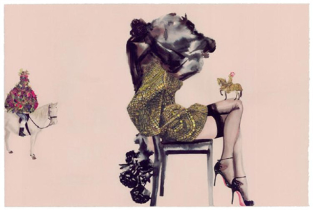 Dawn Black, Pilgrimage, gouache, ink, and watercolor on paper, 14 x 21 inches, 2011.>> Dawn Black’s The Magic Foxhole, inspired by an unpublished J. D. Salinger short story, illustrates a distorted cycle between death and foolishness, portrayed through the use of whimsical colors, fanciful fashion, griefs of war and human behavior. Her ink, gouache, and watercolor works on paper opens at Curators Office with a reception from 6:30 to 8:30 p.m. Saturday.
