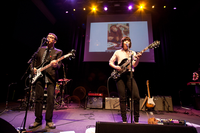 A live variety show of this kind is a natural fit for two career musicians who also act (Armisen is a long-time cast member of Saturday Night Live). The show bounced from banter between the pair to talking and playing live songs with special guests, to a slide show presentation to never-before-seen outtakes from Season 2 of Portlandia. Brownstein and Armisen are of the indie-rock set that honed their performing chops with their bands in the 90s, and so guests on the TV show skew towards musicians making bit cameos in the dialogue. Last night’s performance featured mostly musical guests. Perhaps this was an act of mercy, as the one musician-as-guest, Ian Svenonius, did not play an instrument but bantered for far too long with the pair. They were joined on guitar and keyboards by another two-quarters of Brownstein’s Wild Flag, Rebecca Cole and D.C. native Mary Timony, and touring companion Eleanor Freidberger of Fiery Furnaces.