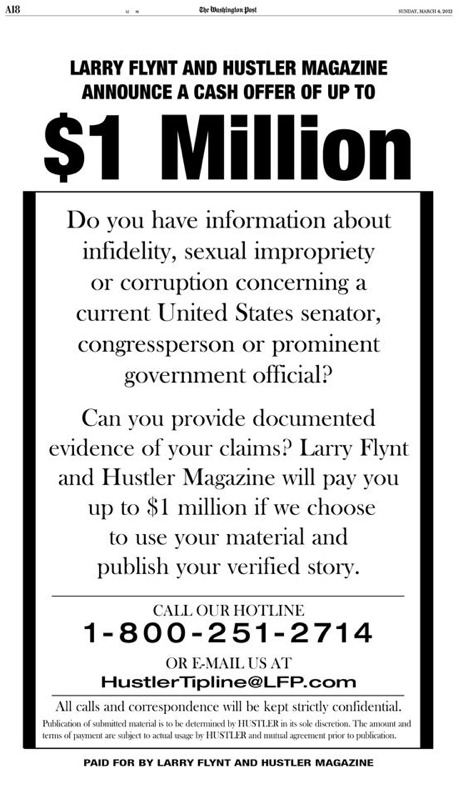In a full-page ad that appeared in the Post yesterday, Flynt again offered $1 million for any hints, allegations or concrete information on sexual dalliances involving members of Congress or senior government officials. It’s hardly a new offer for Flynt—last year, he pledged the same amount for any information regarding Rick Perry’s sex life, and he’s taken credit for exposing Sen. David Vitter (R-La.) and former Speaker of the House Bob Livingston.