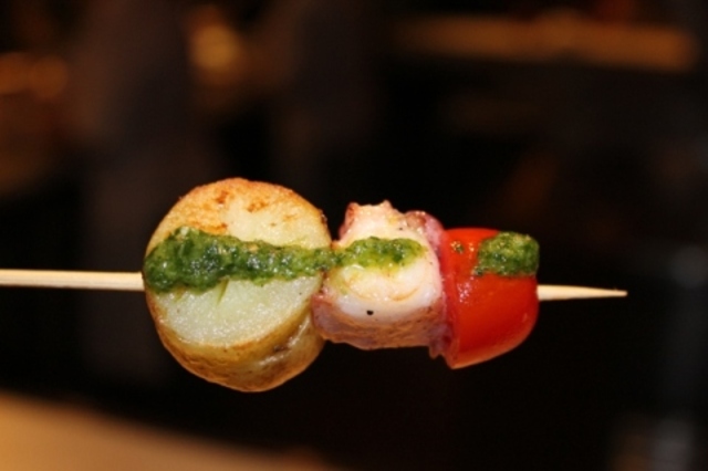 The outer crispness of patatas bravas gives a potato chip like crunch to the dish. Unsurprisingly, dates stuffed with almonds and Valdeon cheese and wrapped in bacon aren’t to be missed. Deep fried shrimp and a skewer with the most tender octopus I’ve ever had don’t appear on the opening menu, but they would be a welcome addition. There are several pork sausage styles and hams that sell for $5 an order. Then there’s Iberico hams, sliced from the butts of the famed acorn-fed, black footed pigs, that sell for $22 and $32 an ounce.