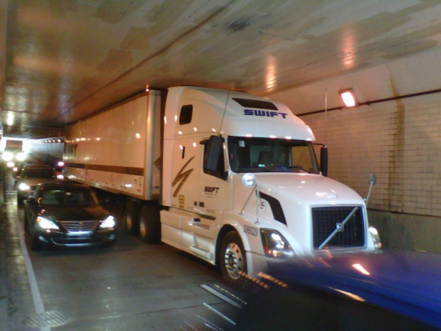 An 18-wheeler traveling down Massachusetts Avenue NW this morning found itself in a bit of a tight squeeze when its driver attempted the underpass at Thomas Circle. In the case of the tunnel, turns out there is such a thing as too big. Police had to shut down one of the eastbound lanes while wedging the truck out of the tunnel.