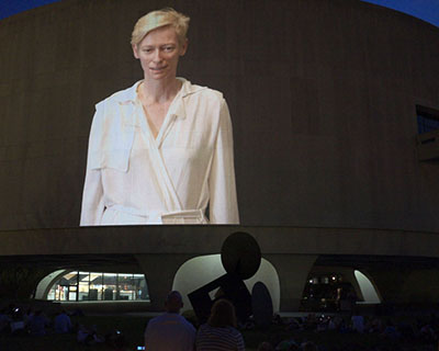 Tilda Swinton in Doug Aitken’s Song 1. Artwork courtesy 303 Gallery, New York; Galerie Eva Presenhuber, Zurich; Victoria Miro Gallery, London; and Regen Projects, Los Angeles. Photo by Pat Padua.Forget the Bubble. This spring’s most anticipated architectural bauble has already landed at the Hirshhorn. Doug Aitken’s Song 1 hopes to “develop a new vocabulary to turn the world of the moving image inside out.” It doesn’t exactly reach such a lofty vision, but it’s a diverting spectacle the likes of which Washington has never seen. It’s good reason to head out to L’Enfant Plaza after sunset.