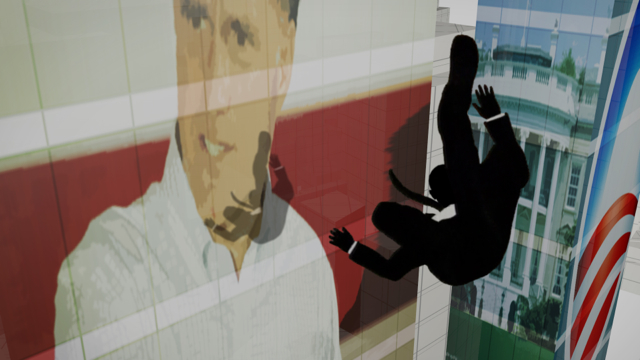 A silhouetted cutout in the president’s shape replaces the Saul Bass-inspired “falling man.” Photos of Michelle Obama, the president’s dog, Bo, and Vice President Joe Biden tumble off an Oval Office wall. And while Don Draper falls past a skyline filled with ad copy and pretty girls, “falling Obama” passes by billboards of his Republican rivals and economic warning signs like spiking gasoline prices and federal government debt.
