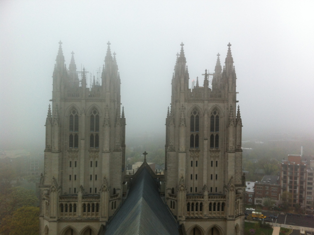 But since last August, when a 5.8 magnitude earthquake fractured some of the cathedral’s Gothic details and caused about $20 million in damage to the structure that was first laid down in 1907. After several months of exhaustive inspections, the central tower was finally reopened to the public for the first time since the temblor. All day Saturday, hundreds of curious people ascended a narrow, darkly lit stone passage and two forbidding spiral staircases to an observation point that would have provided stunning views of Northwest D.C. and beyond were it not for a thick layer of fog. (Disclosure: We took an elevator for part of the trip to the top.)