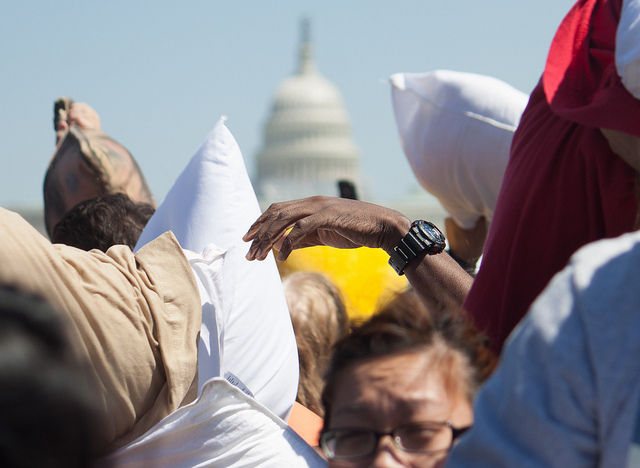 Yesterday was International Pillow Fight Day, and a lively crowd gathered on the National Mall to beat the crap out of each other (with pillows, of course). Flickr user vpickering captured the image as best one could: pillows framed by the backdrop of the iconic U.S. Capitol.